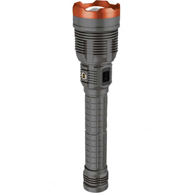 Very high quality LED power spotlight. Housing is made of aluminium. Powerful 8,000 lumens and the 80 Watt LED provide sufficient brightness. Battery: 7.4V 5000mAh battery, USB output: 5V/1A. Length: 29.5 cm, Ø: 6.2 cm. Light range approx.: 200 m. Weight approx.: 700 g incl. battery. Scope of delivery: Tactical power spotlight, USB cable, USB charger, battery.