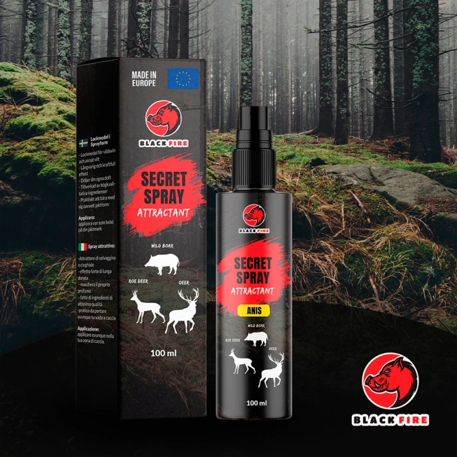 Small and easy to carry with an extremely strong scent due to the high quality ingredients in the spray. Add Black Fire Spray to baits such as maize to enhance its smell and improve your chances of successfully attracting wild boar and other wildlife. Black Fire Spray is designed to enhance your hunting attractant. Add the spray to attractants or baits you are already using to increase your hunting success and intensify the scent. This spray is the most practical option for use when hunting wild boar, deer and roe deer. Black Fire Secret Spray is an ultra-premium attractant booster that you can spray in your hunting area to have a long-lasting and charged scent. When you go hunting, you can apply this spray to the sole of your boots. This way you will spread the strong scent of aniseed as you walk around not only where your cameras are set up, but also in the surrounding area. Aniseed has been known for years as one of the strongest scents that wild boar and other game simply cannot resist. Strong scents have been added that have been proven to attract wild boar and game, increasing your chances of hunting success. Content: 100ml.