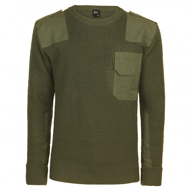 Angenehm zu tragender, gerade geschnittener Pullover mit robust verstärkten Ellenbogen- und Schulterpartien, Schulterklappen mit Klettverschluss, Strickbündchen an Ärmel- und Bundabschluss und aufgesetzter Brusttasche mit Klettverschluss und Stift-Tasche. Farbe: oliv. Knitted outer fabric: 100% polyacrylic, textile outer fabric: 100% cotton.