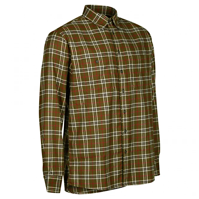 Shirt in modern check pattern with reinforced button-down collar and central movement folds on the back for better comfort. The right breast pocket has a button, the left has a pencil pocket. Colour: Green Check. Material: 100% polyester.