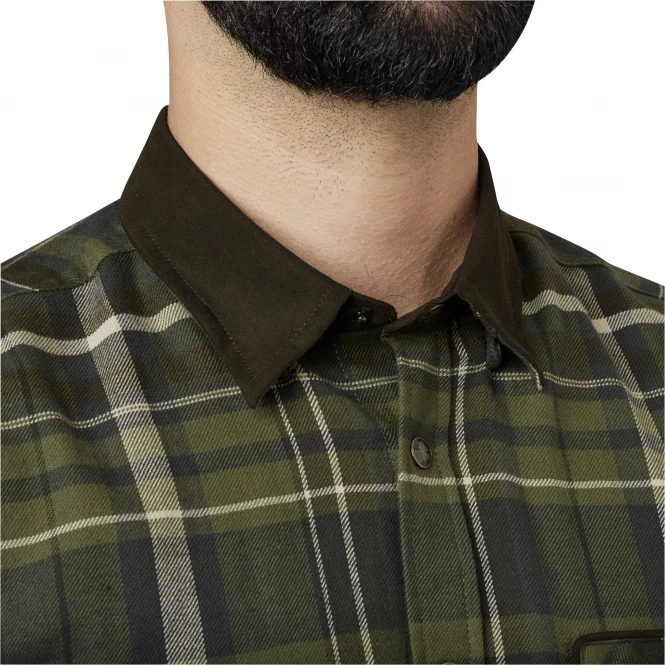 Sporty shirt Pajala from Härkila in strong, soft flannel quality with a distinctive check pattern. The collar, cuffs and elbows are reinforced with micro suede trim. Two spacious breast pockets-left with horizontal zipper and right with vertical zipper-offer enough space for various things. In addition, this comfortable hunting shirt is equipped with a concealed button-down collar, snap front placket and sleeve cuffs with 2-position snap closure. Colour:olive check. Material: 100% cotton.