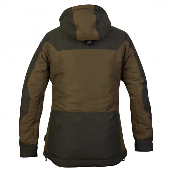 Waterproof jacket made of soft but durable fabric, low-noise on the outside, warming padding on the inside (HDI160). The OSMOTECH membrane also makes this jacket windproof and waterproof. Thanks to the colour combination and the reversibility, it is a versatile jacket for all kinds of outdoor activities in winter. 2 zipped cargo pockets combined with side pockets for extra storage space and long hand warmer pocket in the chest area. Detachable and adjustable hood. Colour: green/camo blaze. Outer fabric 1: 45 % cotton, 35 % polyester, 20 % nylon, outer fabric 2: 94 % polyester, 6 % elastane, padding and lining: 100 % polyester, membrane: 100 % polyurethane.