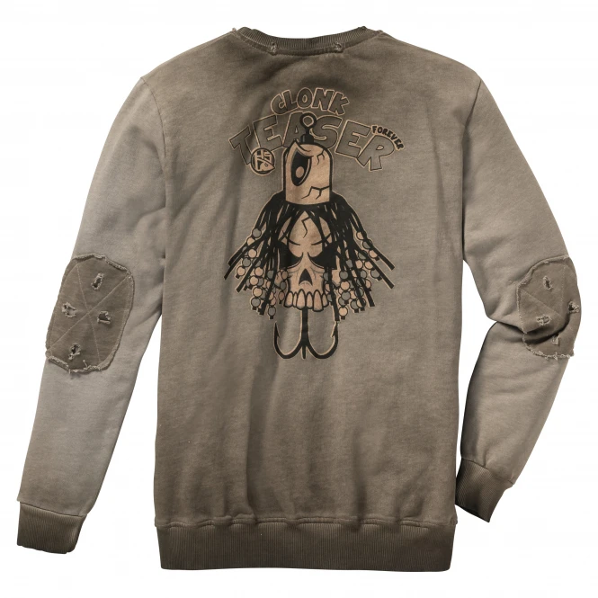 Cotton sweater for all seasons. With motif on the chest and back. Elbow patches with a scattering of nicky holes, front patches with ragged edges, ripped and cut details add a smarter look that simulates natural wear and fray. Colour: brown/olive. Material: 100 % cotton.
