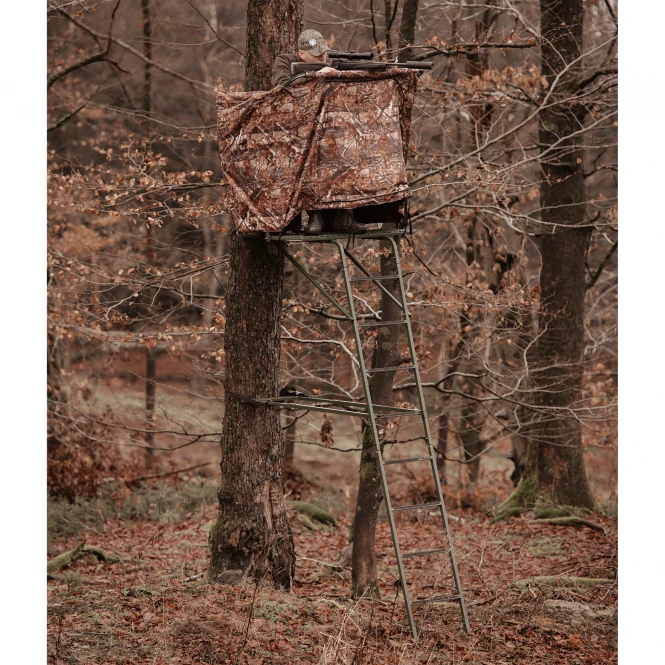 XL mammoth tree ladder. Held very wide and thus easily occupied by 2 people and equipment. Comes with padded seat cushion and arm and gun rest. Height: 520 cm. Seat area: 115 x 35 cm. Max. Load capacity: 300 kg. Transport length: approx. 150 cm. Total weight: approx. 43 kg. Assembly time: approx. 60 – 120 minutes. Colour: olive green. Delivery without tent (order no. 211903). Material tent: 100% polyester