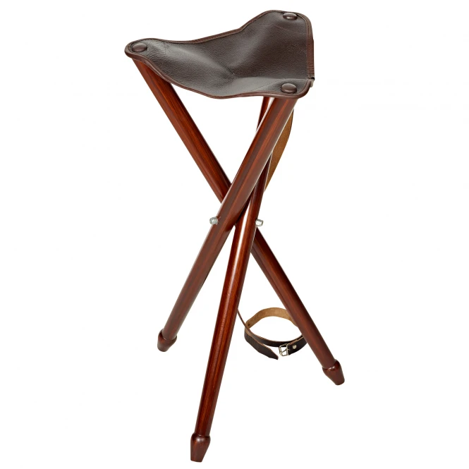 Comfortable leather stool. With a leather strap for carrying and securing. Seat height: 70cm. Colour: brown.