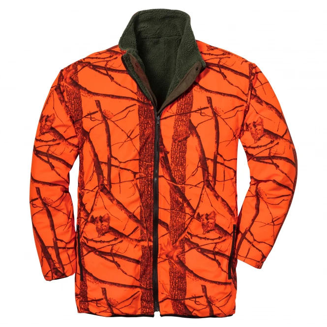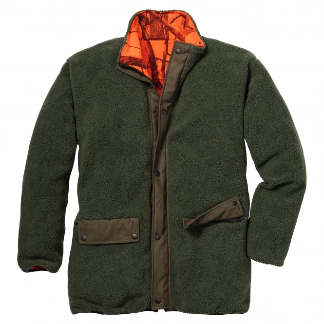 Warm teddy fleece jacket with reversible function. Optimal visibility and special wearing comfort due to soft, warming fleece material. The reversible jacket can be worn in the Warncamou design or in olive green teddy fleece, depending on your needs. Features 2 inside, 2 outside zippered pockets for plenty of storage. Color: olive/camouflage.