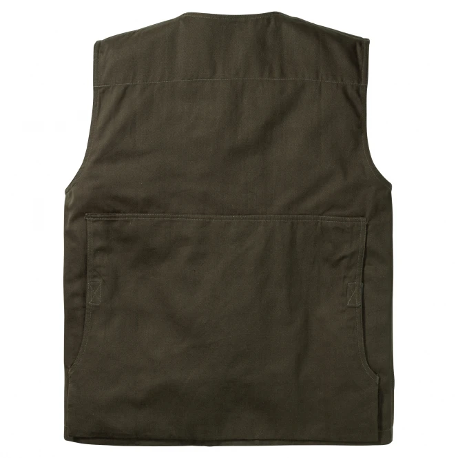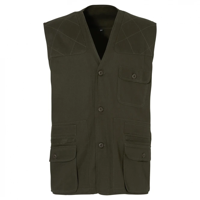 Classic, button-down waistcoat for the ambitious hunter. Ideal for the shooting range, hunting or target practice. With breast pocket, flap pockets and additional zipped pockets as well as large rabbit pocket. Colour: olive. Material: 100% cotton.