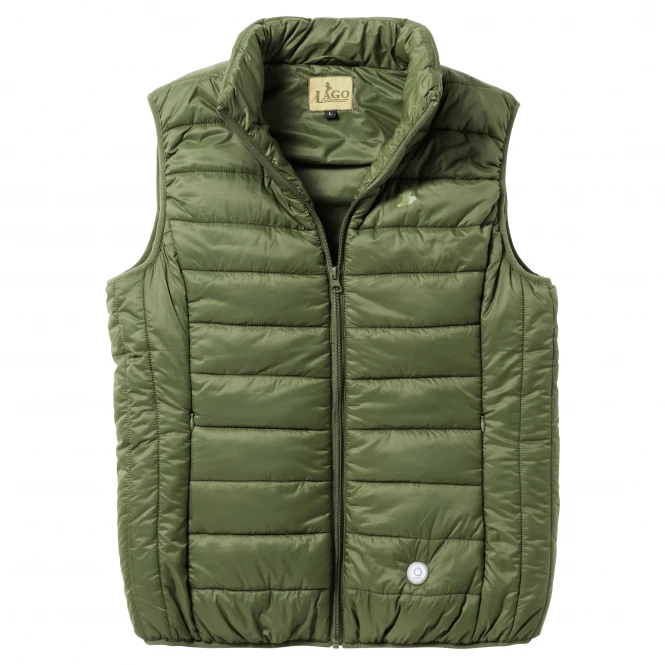 Lightweight quilted waistcoat with heating system in the upper back area and stomach/pocket area. You can adjust the heating levels via a button in the front, left area (on/off, temperature range: 40 °C – 60 °C). With 2 zipped pockets, elastic edged hems, high collar. Including transport bag in which the waistcoat can be stored small. Colour: green.