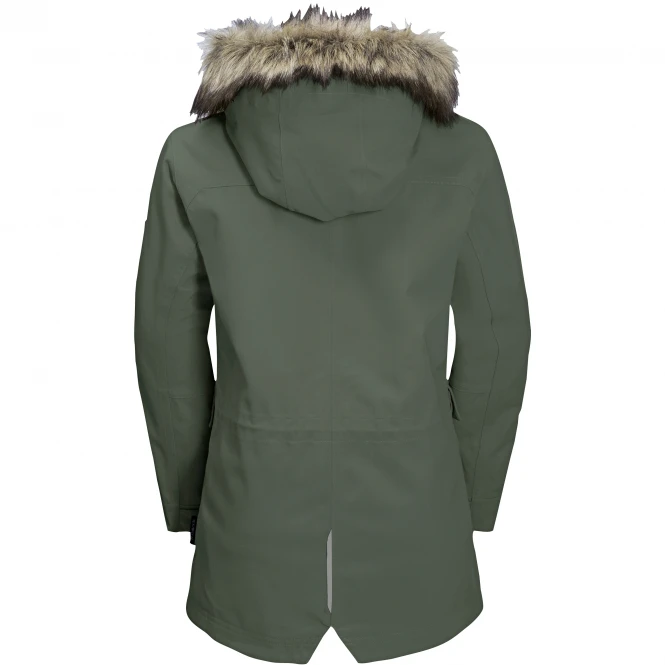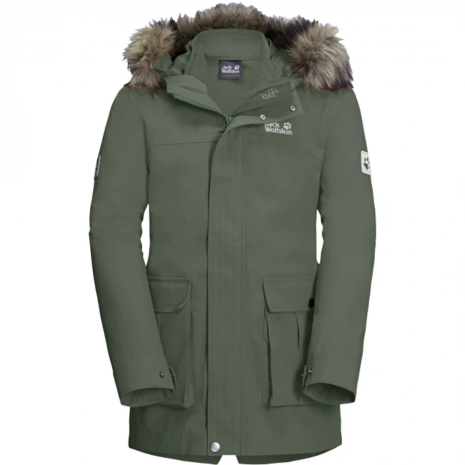 The longer cut outer jacket made of wool-like, waterproof, windproof and breathable material (water column: 10,000 mm, breathability: > 6,000 g/m²/24h) is adjustable by waist drawstring, has two hip patch pockets and protective but removable synthetic fur on the hood. With reflective details. The inner jacket made of soft, warm fleece can be worn separately if needed. Colour: thyme green. Outer jacket material and lining: 100% polyester, inner jacket material: 100% polyester.