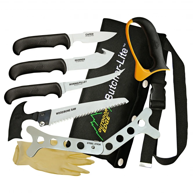 Eight-piece universal set for breaking open, skinning, ringing, preparing, carving and portioning. Blades made of 420 steel, handles made of Kraton. Supplied in convenient rolling pouch. Includes skinner, boning knife, scaper, saw, 2 spreaders, knife sharpener and protective gloves.