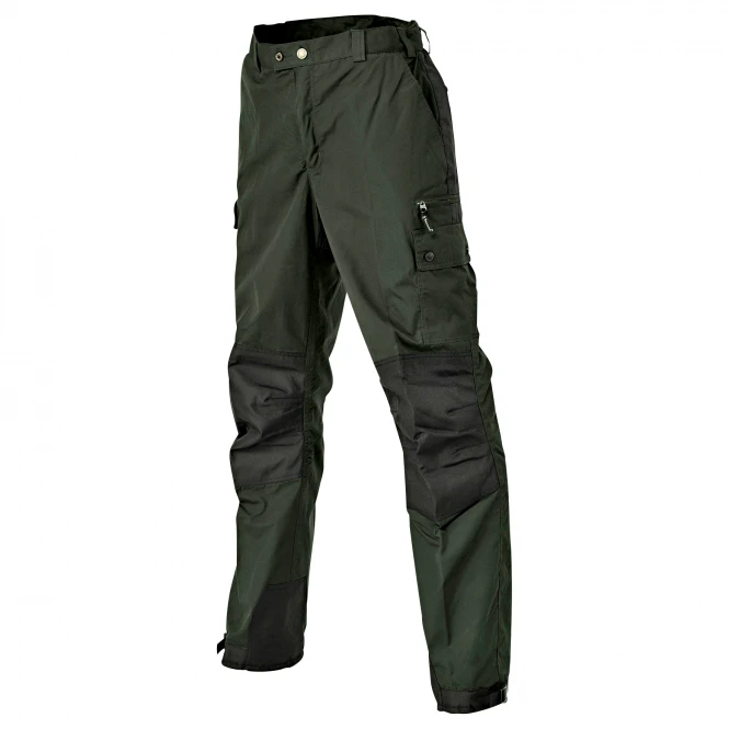 Functional trousers made of durable TC1200™ fabric for the extreme! Weather as well as activities and work! Equipped with a completely windproof, waterproof and breathable membrane. Taped seams. Extra reinforced knees and seat. Preformed knee. Adjustable leg ends. Extra water and dirt repellent thanks to Bionic Finish®. Many practical pockets such as 2 slit pockets, 2 leg pockets, 2 back pockets. Water column: 10,000 mm. Breathability: 14,000 g/m²/24h. Colour: dark green/black. Material: 65% polyester, 35% cotton, with water and dirt repellent Teflon coating. Material reinforcements and lining: 100% polyester.