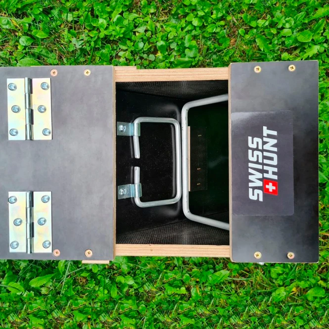 Thanks to double locking and grid protection for all openings, escape is absolutely impossible. Releases extremely finely due to lightweight aluminium linkage and perfectly balanced kicking board release and is therefore also ideally suited for cautious martens. Made from weather-resistant silk-screened panels for extra-long use. The trap stands on 12mm feet and is therefore protected from ground moisture. The catch can be easily viewed through the large viewing window without having to open the trap. Doors and openings are protected from chewing and scratching by grids. The recesses on the footboard make it ideal for baiting with eggs or our SwissHunt catch pellets. Due to very tight manufacturing tolerances, this trap is very dark when closed, which helps to calm the captured game. We could even observe captured martens sleeping in the trap. All screws used are rustproof and the grids are galvanised.