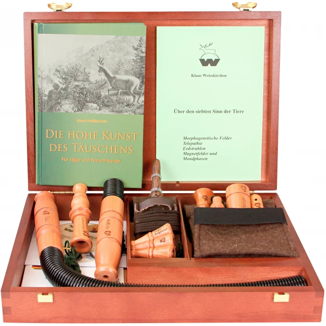 Consisting of: Wild boar elicitor, raven crow elicitor, noble wood mouthpieces in a felt case, fox stimulus and rancid set (hare lament, mouse whistle, fox barker and fox flute), crow death lament.